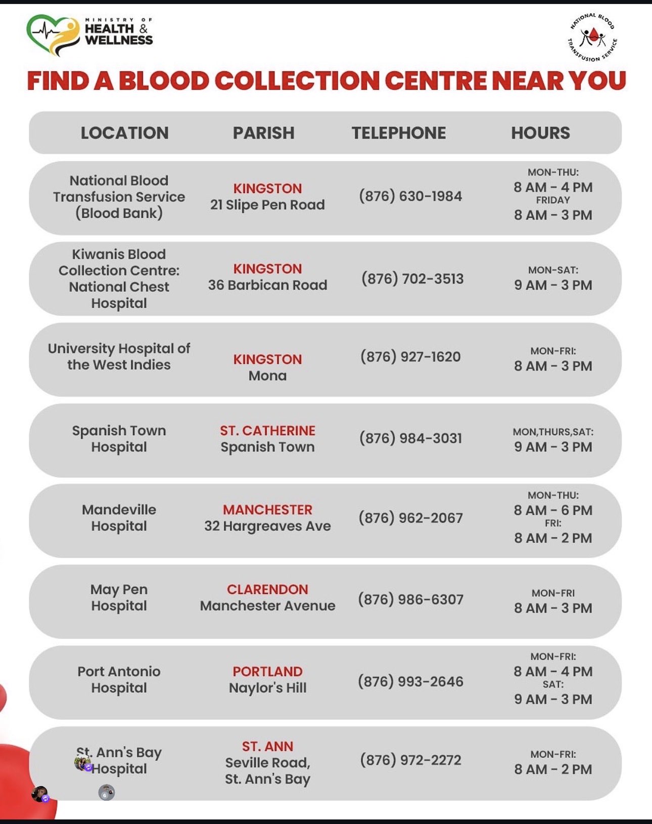 Donate Blood: The Ministry of Health says that “national blood supplies are critically low” indicating an urgent need for blood donations at multiple locations around the island.
